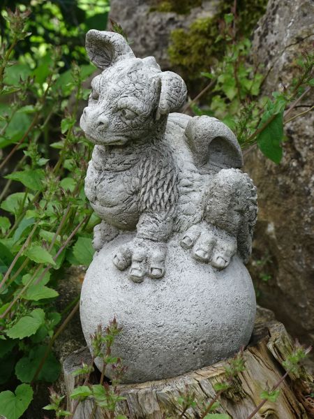 Drache auf Kugel sitzend aus Steinguss, antik grau